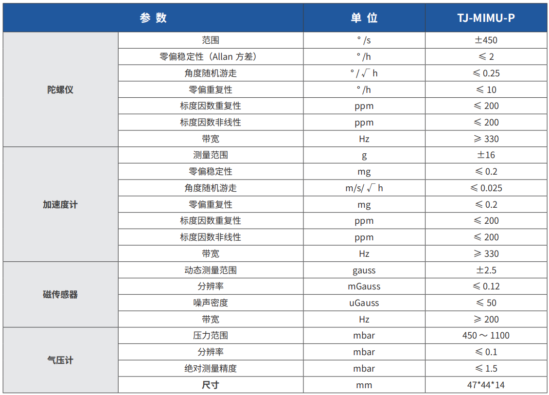 TJ-MIMU-P 是一款基于微机械(MEMS)技术的小体积、高性能、低价位的十自由度惯性测量单元,主要用于敏感系统载体三个正交轴上的角速率、加速度、磁场强度以及载体所在地区的气压,通过数字信号将采集的信息输出。