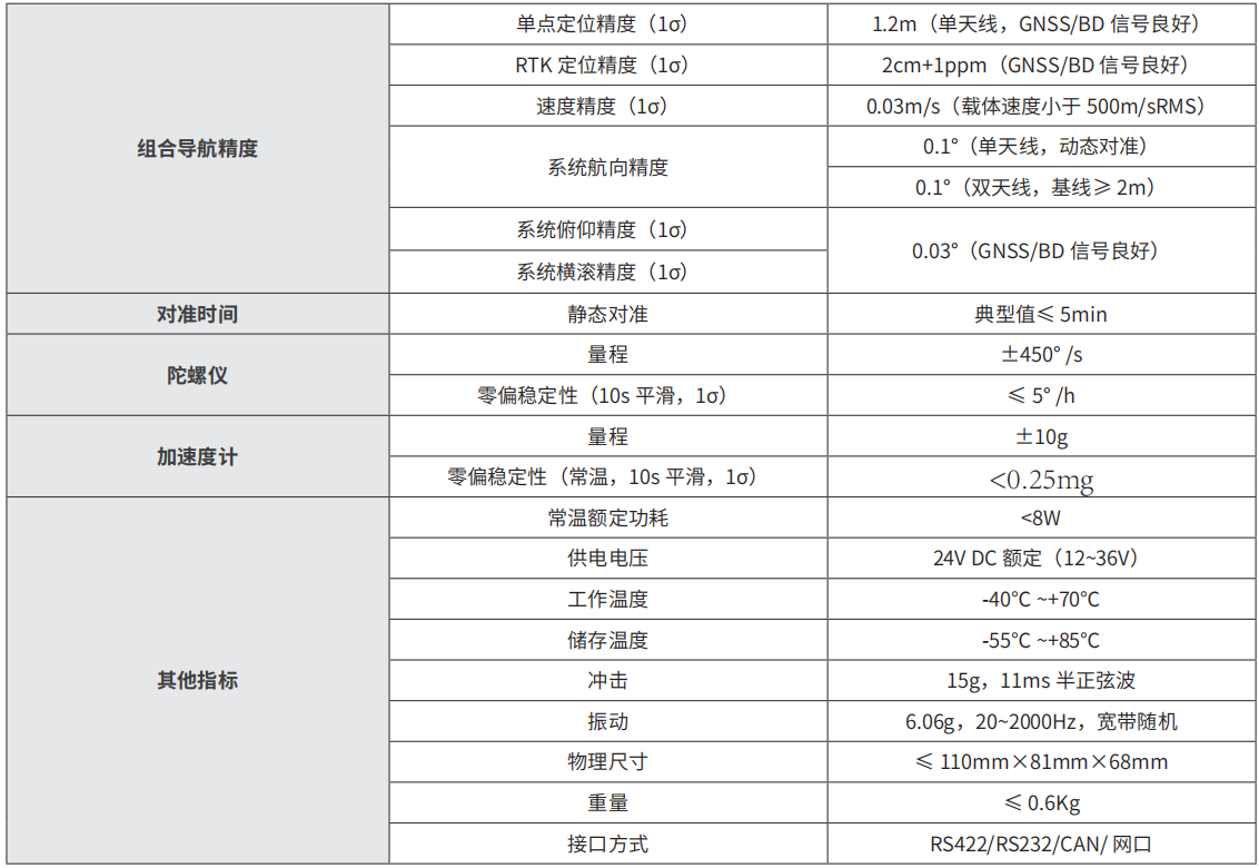航向精度:0.1°(单天线)、0.1°(双天线)