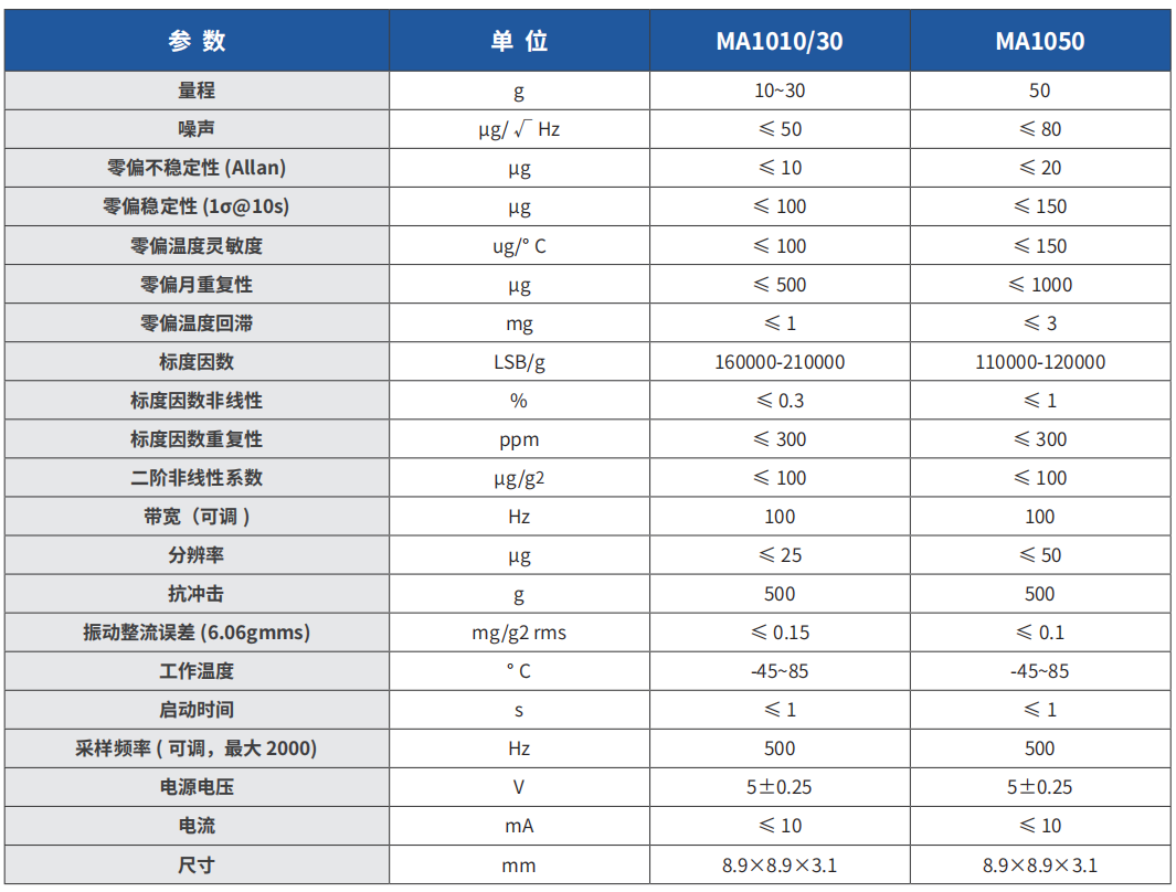 MA1000 系列数字 MEMS 加速度计是一款高性能、高可靠、全国产化的硅基 MEMS 惯性传感器。具有噪声小、稳定 性高、重复性好、非线性小、温度漂移小、抗振动等特点。MA1000 系列 MEMS 加速度计内部包含温度传感器,支持片内温度补偿。