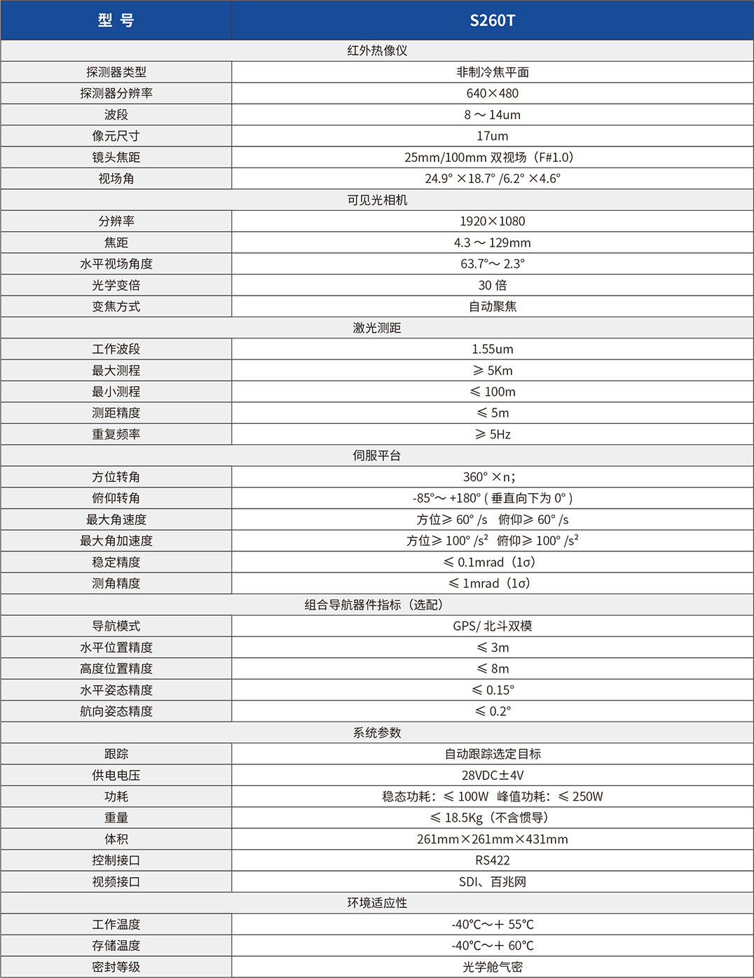 S260T 两轴三光电吊舱集成了 640×480 高分辨率双视场红外相机、30 倍 1080P 全高清输出可见光相机、5Km 高精度激光测距机、高精度惯导及高精度稳定平台。吊舱稳定精度高,可对跟踪目标精准定位,能够在白天和夜间工作,快速搜索大面积区域或近距离检测人员无法到达的区域。