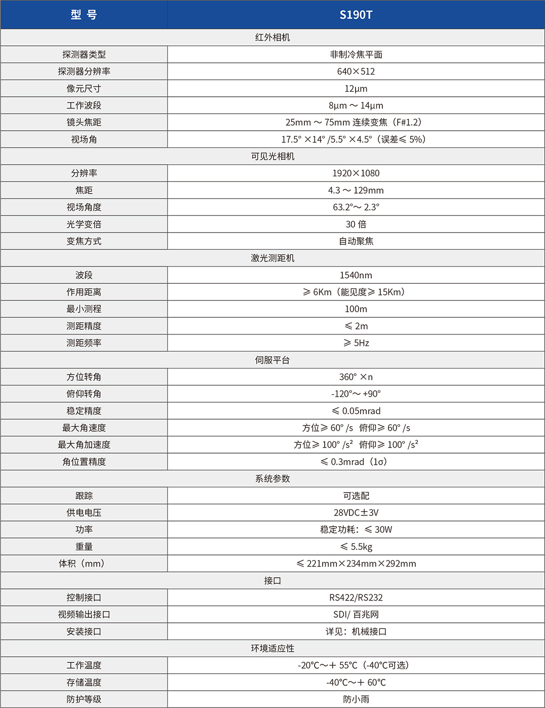 S190T 两轴三光吊舱集成了 640×512 高分辨率红外探测器,30 倍光学变倍全高清可见光相机,最远达 6Km 激光测距机以及高精度陀螺稳定平台。吊舱稳定精度高,能够在白天和夜间工作,快速搜索大面积区域或近距离检测人员无法到达的区域,让工作更加高效,轻松和安全。