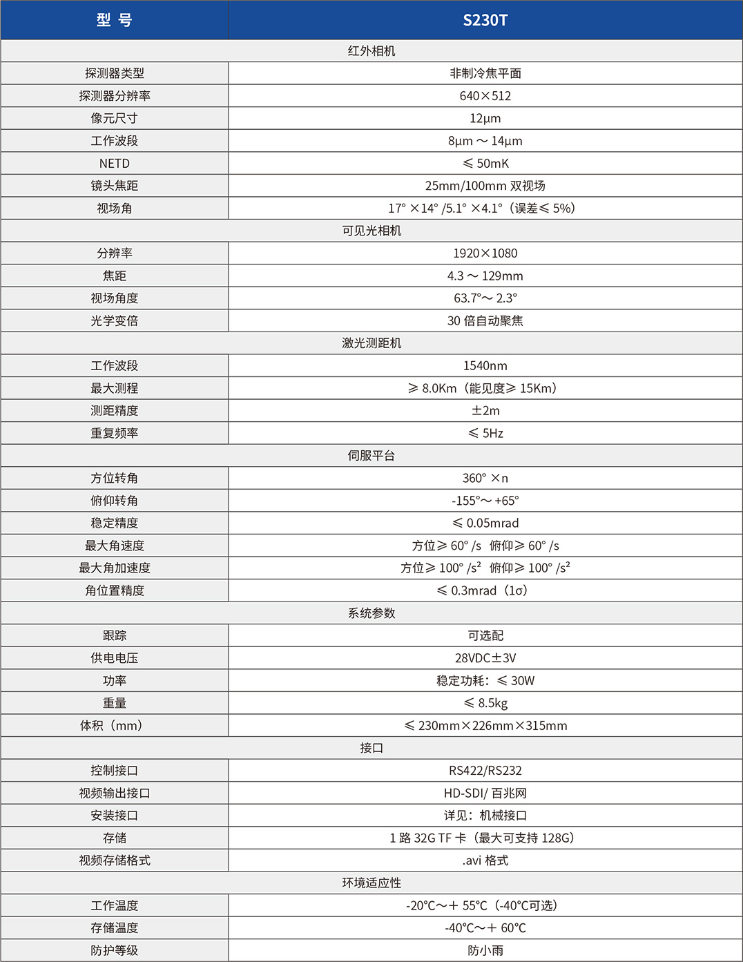S230T 两轴三光吊舱集成了 640×512 高分辨率红外探测器,30 倍光学变倍全高清可见光相机,最远达 8Km 激光测距机以及高精度陀螺稳定平台。吊舱稳定精度高,能够在白天和夜间工作,快速搜索大面积区域或近距离检测人员无法到达的区域,让工作更加高效,轻松和安全。
